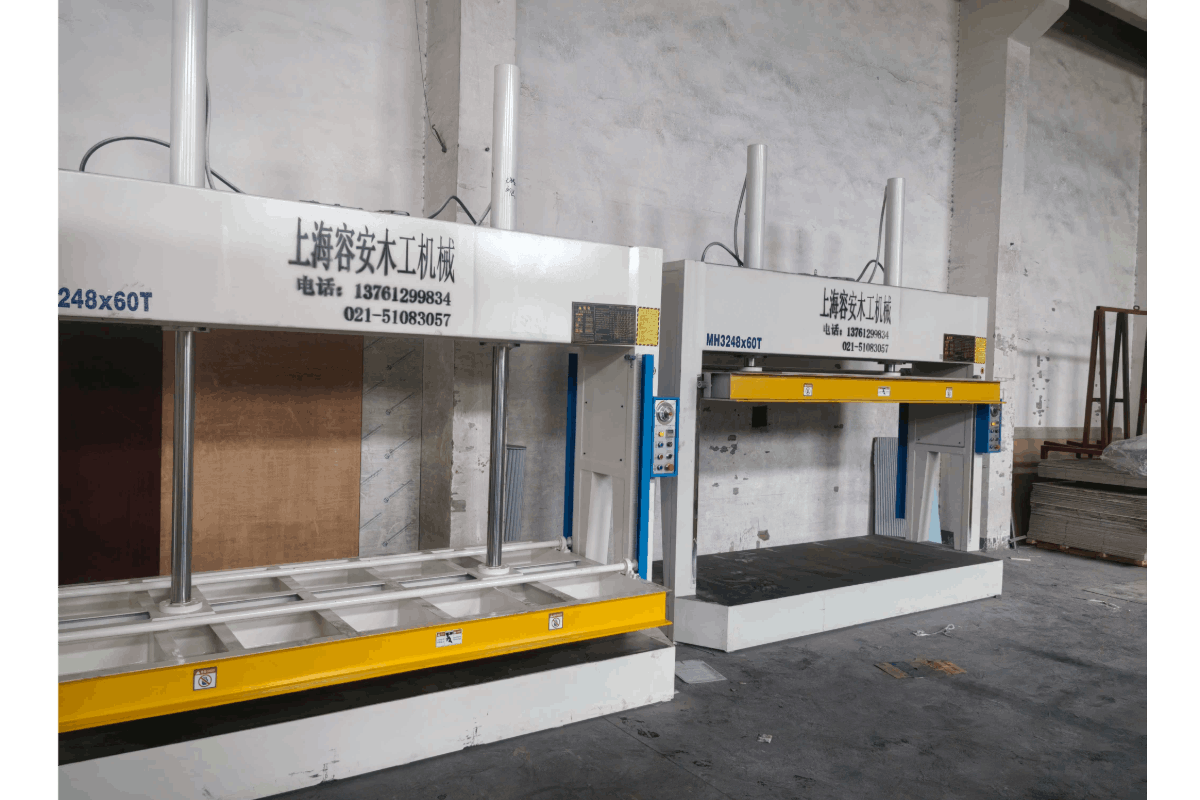 板材在送料装置下送入压机工作区,液压系统提供均匀压力,压板上下运动完成压合。整个过程自动化程度高,可连续生产多片板材,提高生产效率。